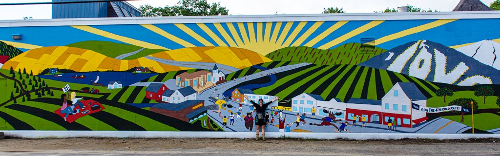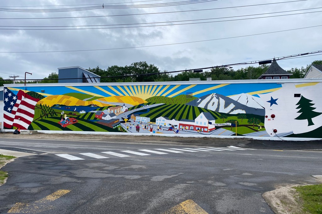 2023 – Jim Cossey, President, and Bill Graham, Race Director, of the Bridgton, Maine’s 4 on the Fourth Road Race initiated a plan for a privately funded mural to be painted on the west side of the Food City Building in Pondicherry Square. The mural design would reflect the road race, the town of Bridgton & the state of Maine.