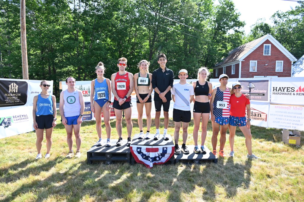 Bridgton’s 4 on the Fourth 2025 Winners: 1st Place-Sam Laverdiere & Caroline Livingston (center),